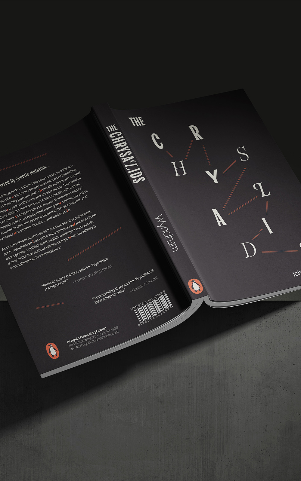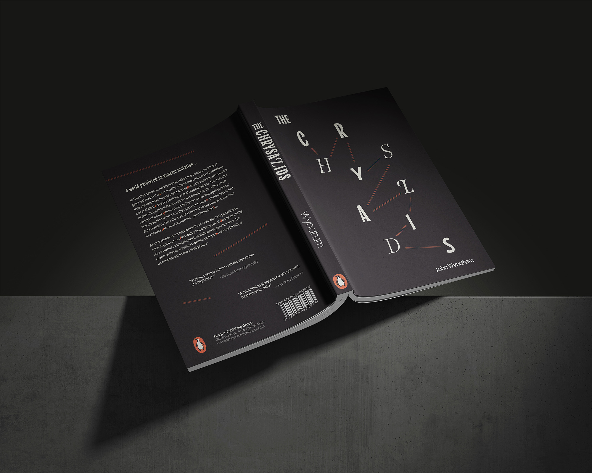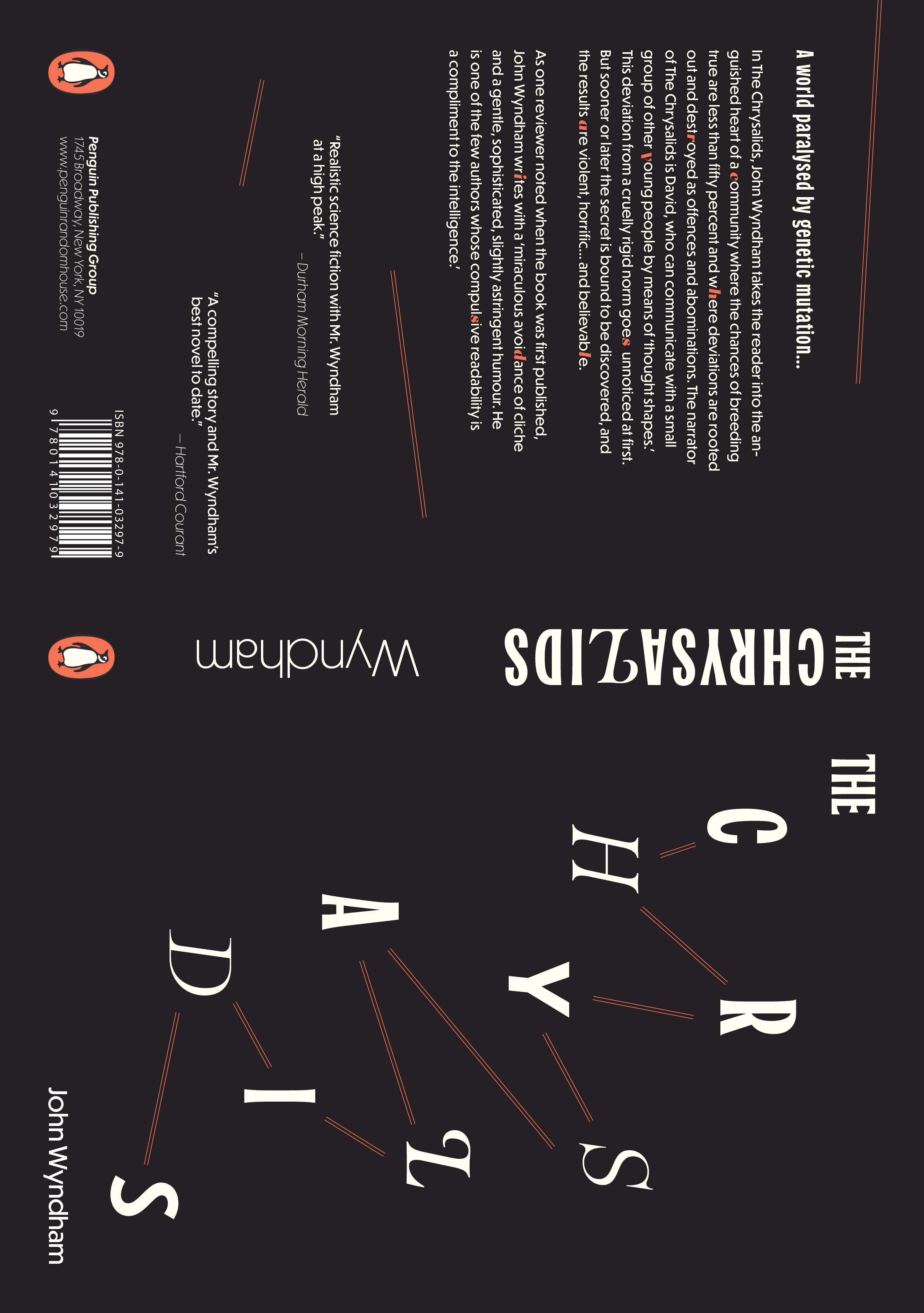 Taking place in a dystopian future inhabited by both 'regular' people and those with genetic mutations (such as additional body parts and telepathy), The Chrysalids makes an alluring candidate for a typography-based book cover. I explored multiple ways to represent genetic differences and telepathy through repetition, changing placement, and varying typefaces. In my final edition, I use pairs of parallel lines to invoke chemical bonds and an assortment of fonts to represent genetic variation.